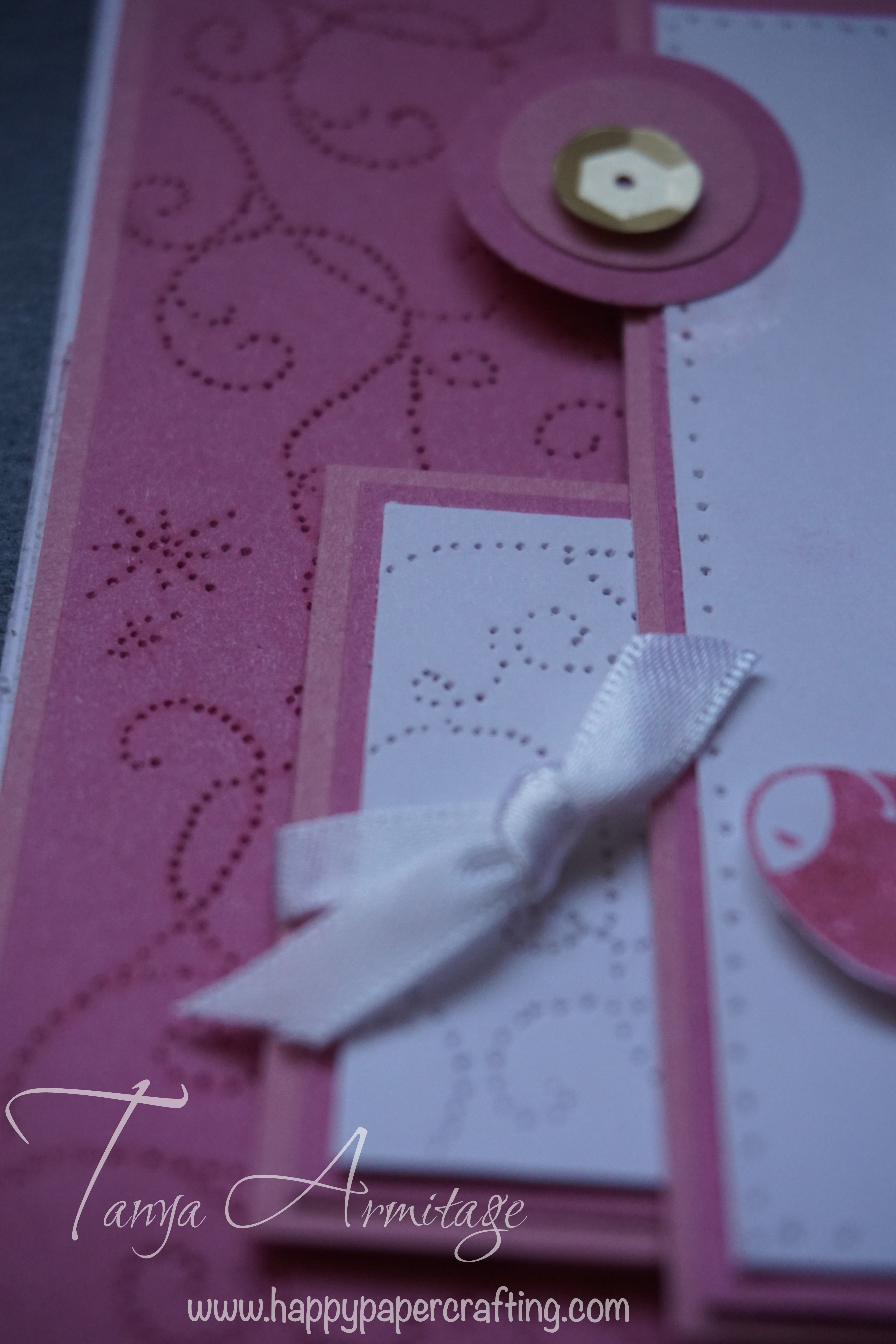 I chose not to use a pattern paper for the background but did not want to use plain colour. So I created a bit of texture with the Stitch Guide and Piercing and Embossing tool. I used the triangle to create a fun pattern in the background card stock. I also pierced a border on photo mat with the piercing tool. This is a tool I love so much and have done a few projects using it to create fun backgrounds. Take a look here and here