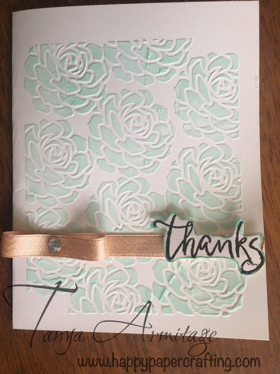 I used the thanks from the October SOTM set to stamp thanks on a scrap piece of white cardstock and edged it with the Mint Shimmer brush. Once the paste was dry I then stuck the ribbon down with Liquid glass and used 3D foam tape to stick the word thanks down. I then added a ribbon bow and placed a glitter gem in the centre.